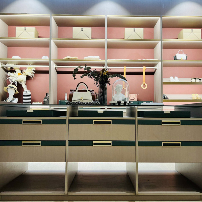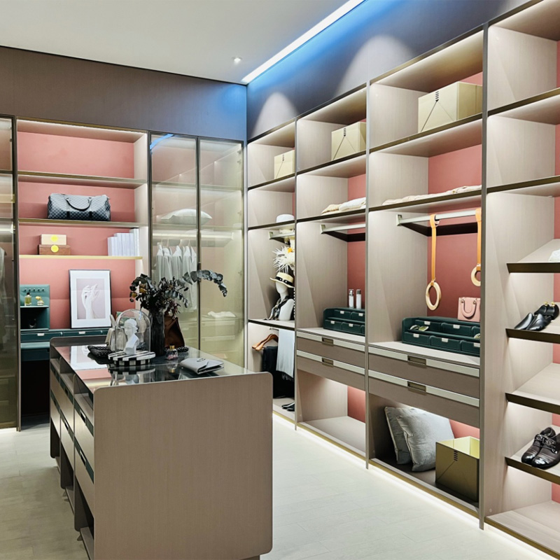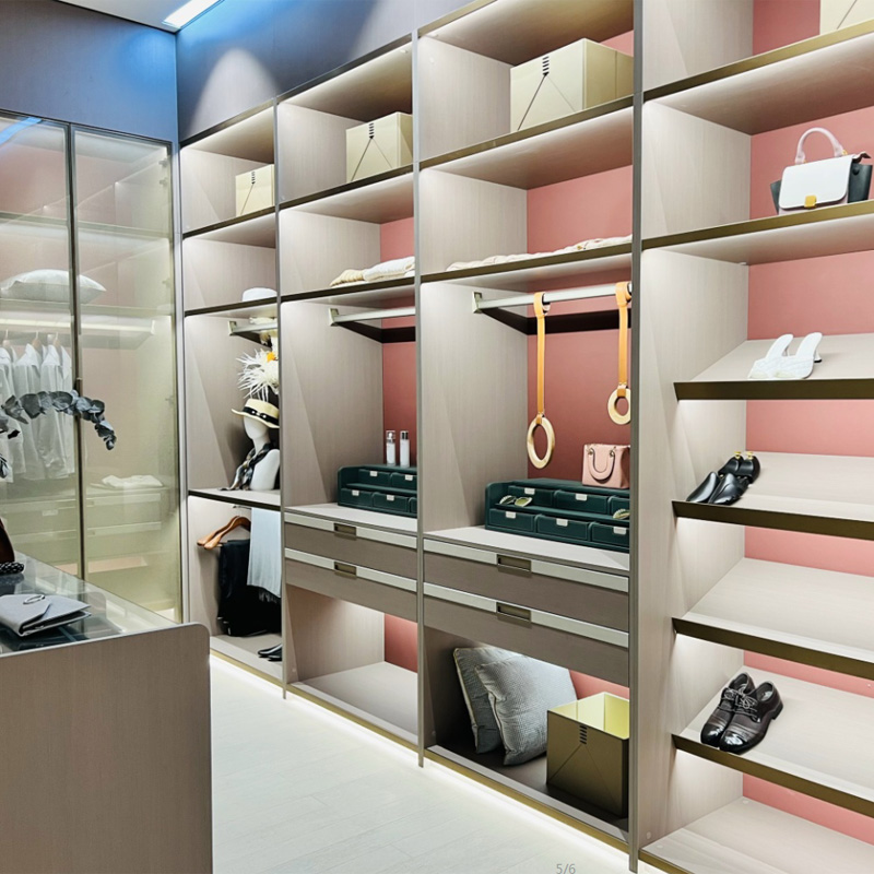 ตู้เสื้อผ้าแบบ walk-in-room นี้ออกแบบด้วยเนื้อไม้เมลามีน วิชวลเอฟเฟค หรูหรา มีชีวิตชีวา เหมาะสำหรับคนหนุ่มสาวที่ประสบความสำเร็จ ประยุกต์ใช้กับวิลล่า โครงการทาวน์เฮาส์