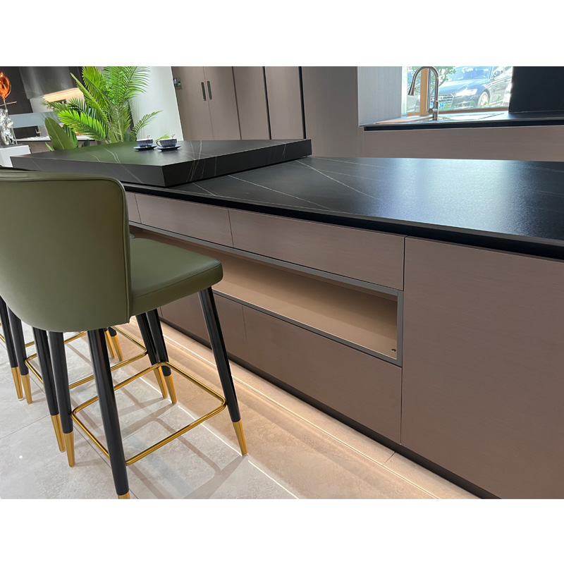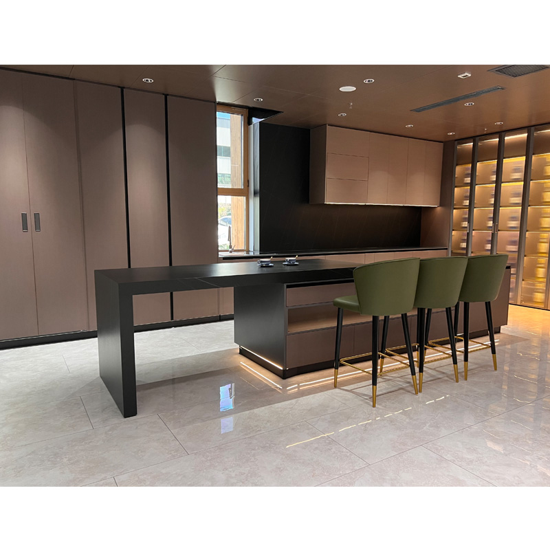 ตู้ครัวอัจฉริยะรูปตัว L ตู้ครัวหรูหราพร้อมตู้ครัวกระจก ตู้ครัวสีน้ำตาลและตู้ครัวกระจกออกแบบมาอย่างยอดเยี่ยมเพื่อมอบประสบการณ์หรูหราเบา ๆ เมื่อคุณทำอาหาร ตู้เตรียมอาหารได้รับการปรับให้เหมาะกับชุดครัวทั้งหมดของคุณ .
